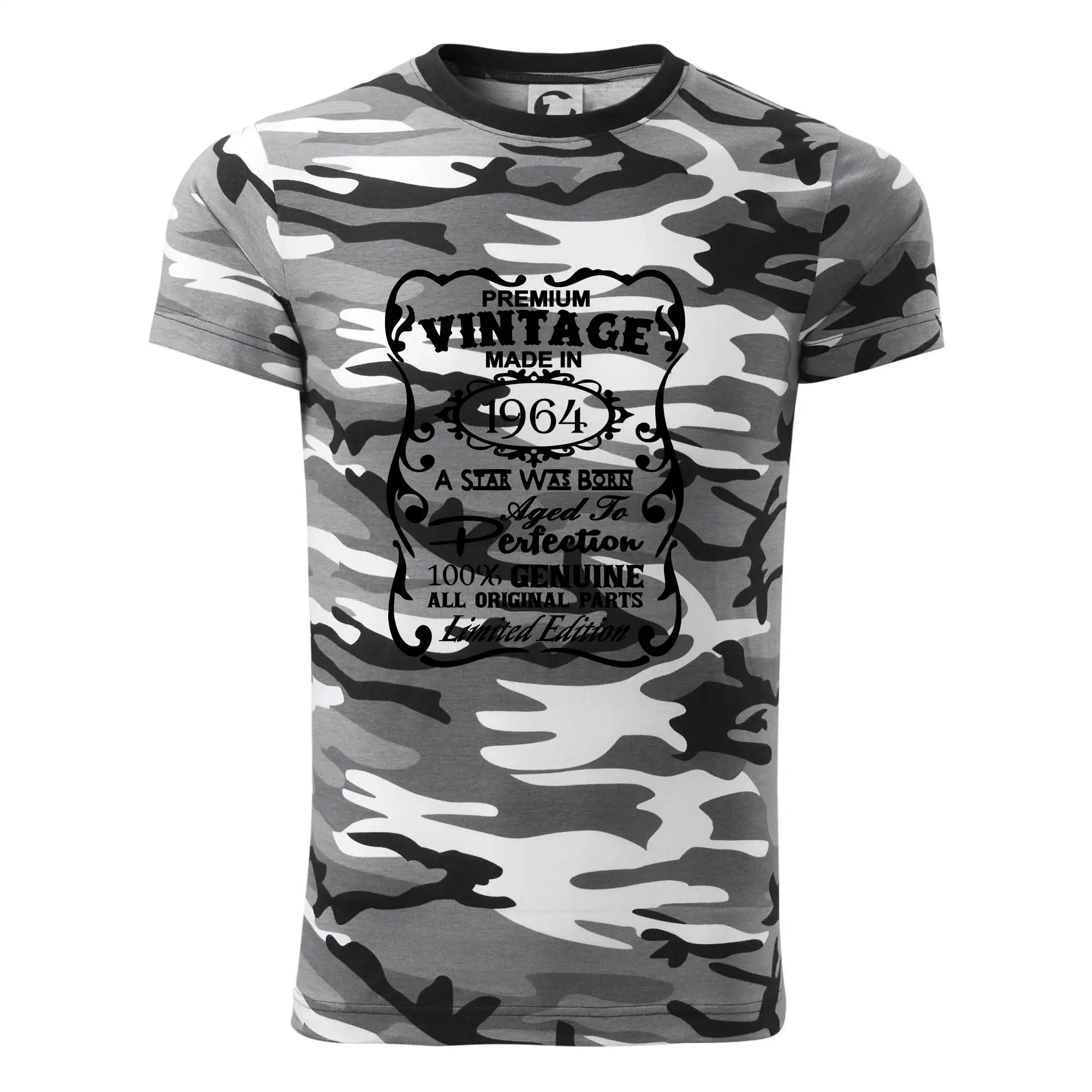 Tričko střední gramáže v barvách camouflage. Střih s bočními švy. Lem průkrčníku ze žebrového úpletu s přídavkem 5 % elastanu. Vnitřní část zadního průkrčníku začištěna páskou v barvě camouflage.
