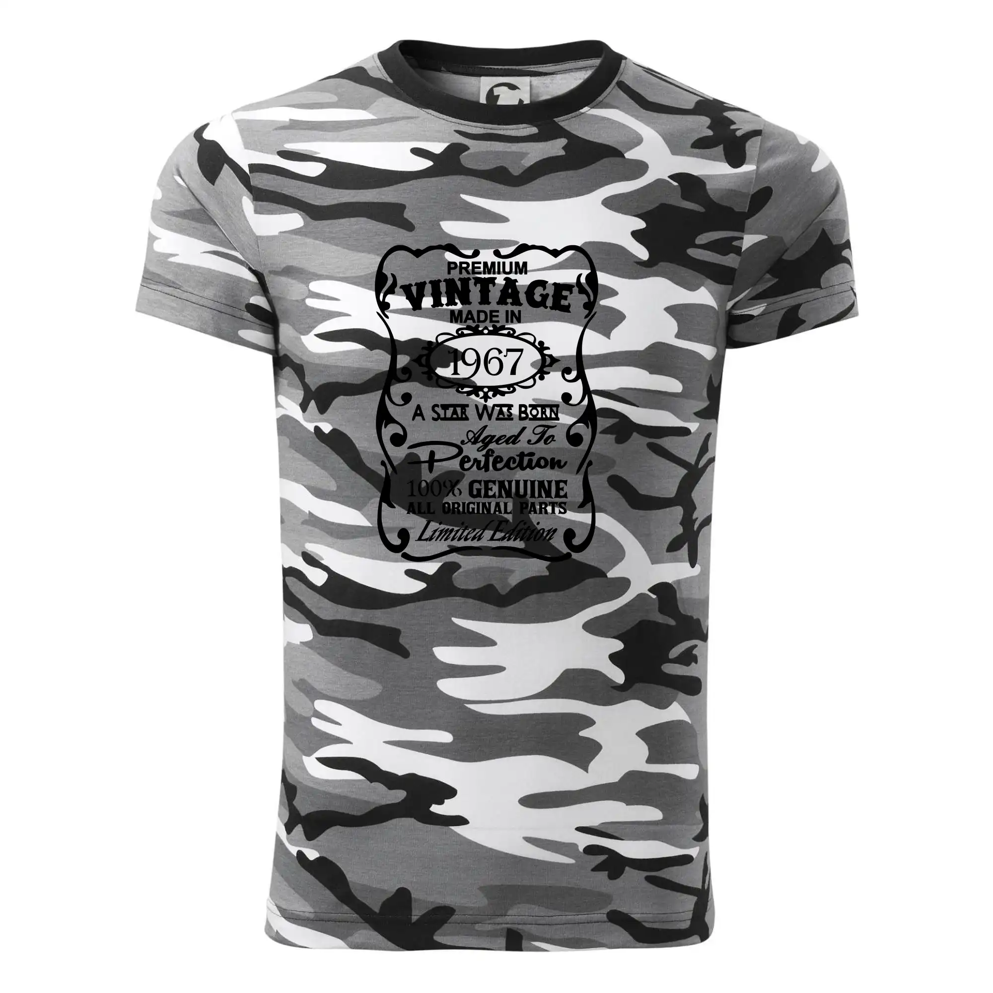 Tričko střední gramáže v barvách camouflage. Střih s bočními švy. Lem průkrčníku ze žebrového úpletu s přídavkem 5 % elastanu. Vnitřní část zadního průkrčníku začištěna páskou v barvě camouflage.