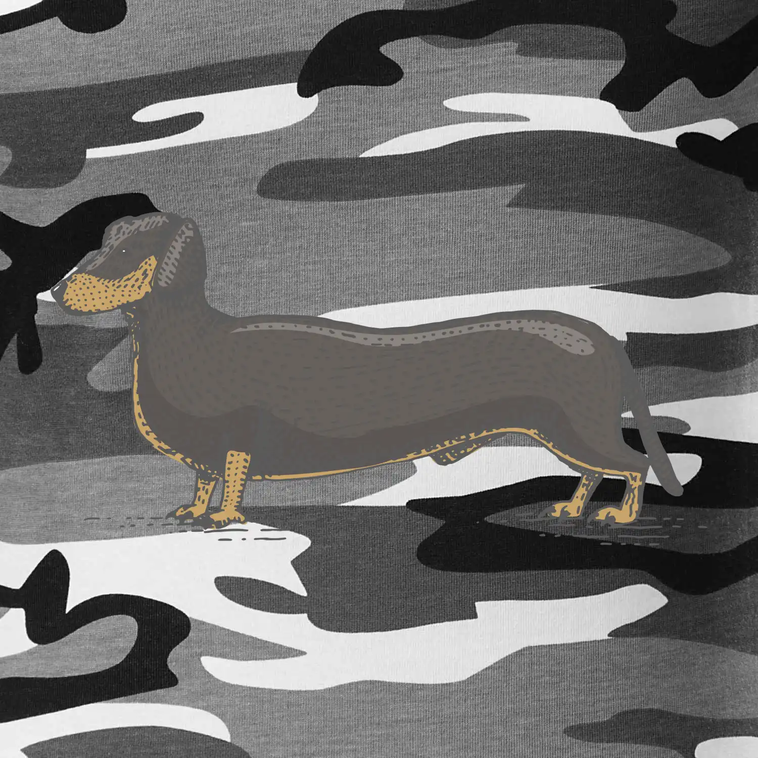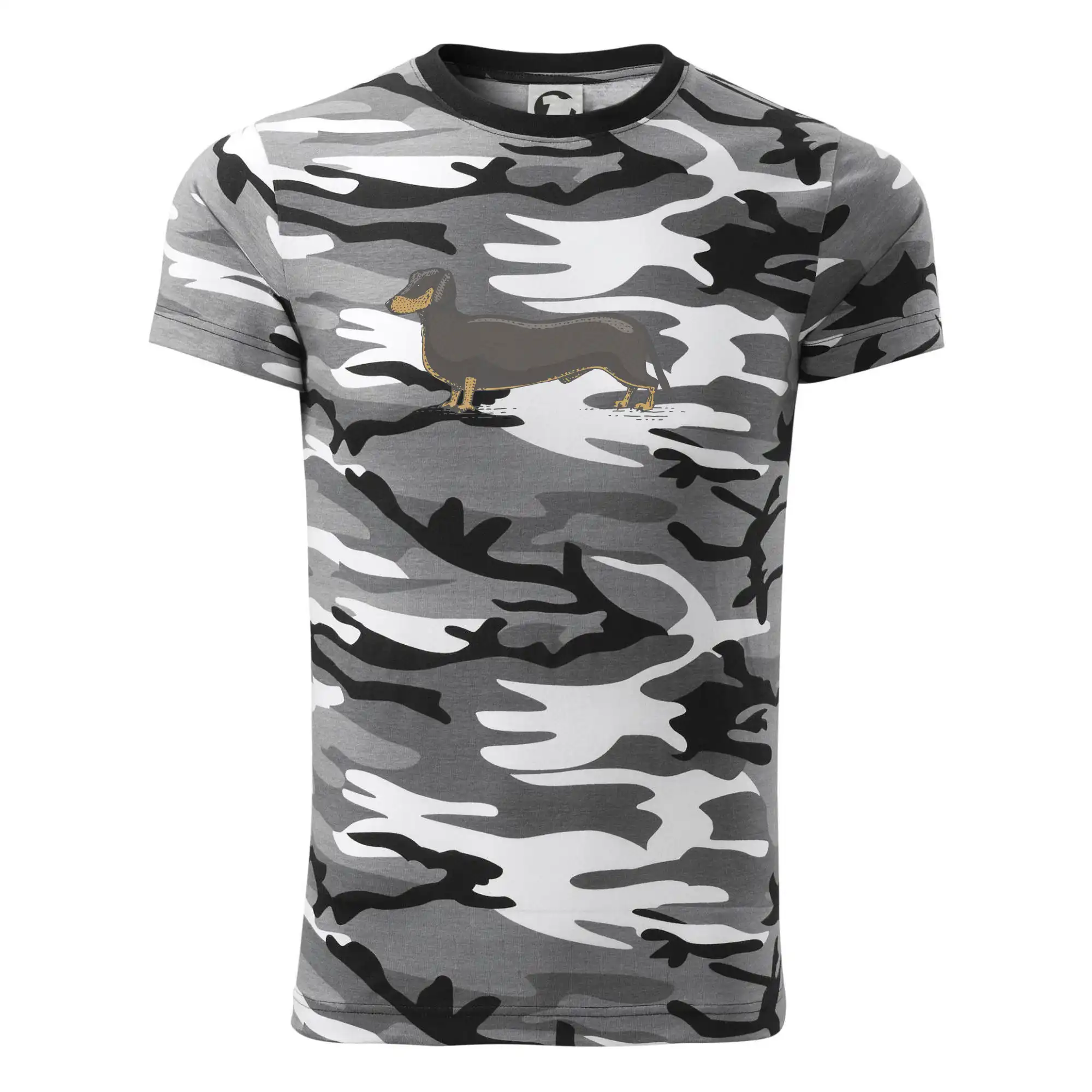 Tričko střední gramáže v barvách camouflage. Střih s bočními švy. Lem průkrčníku ze žebrového úpletu s přídavkem 5 % elastanu. Vnitřní část zadního průkrčníku začištěna páskou v barvě camouflage.