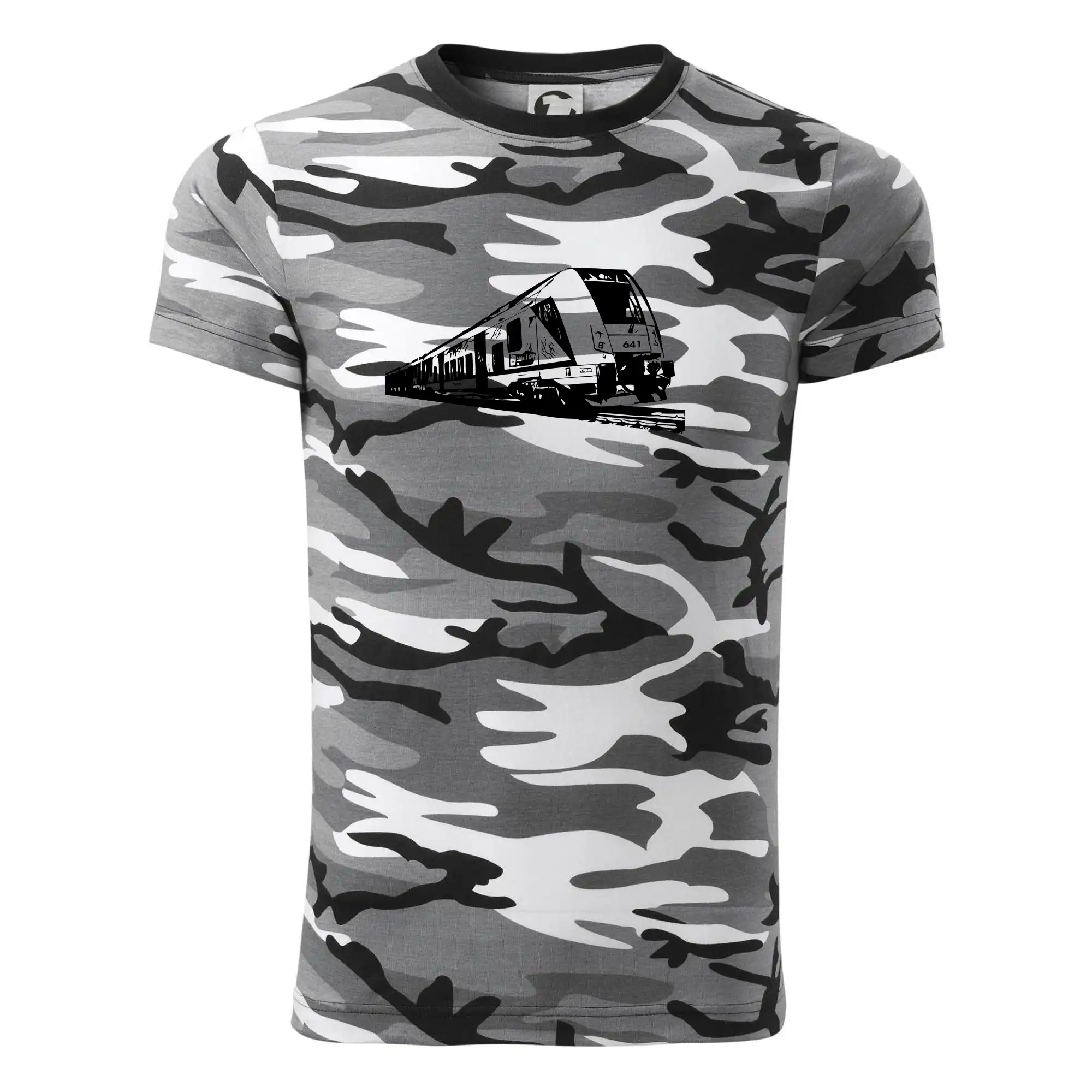 Tričko střední gramáže v barvách camouflage. Střih s bočními švy. Lem průkrčníku ze žebrového úpletu s přídavkem 5 % elastanu. Vnitřní část zadního průkrčníku začištěna páskou v barvě camouflage.