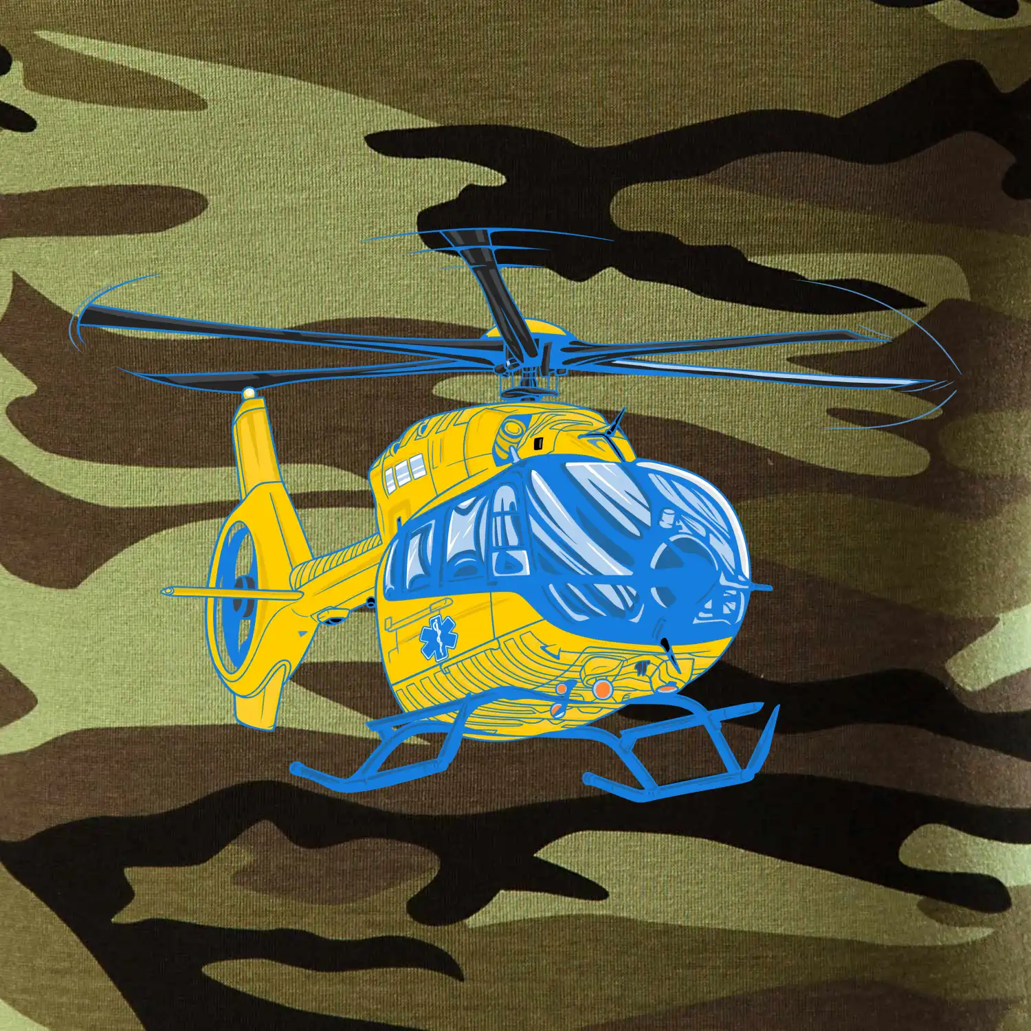 Tričko střední gramáže v barvách camouflage. Střih s bočními švy. Lem průkrčníku ze žebrového úpletu s přídavkem 5 % elastanu. Vnitřní část zadního průkrčníku začištěna páskou v barvě camouflage.