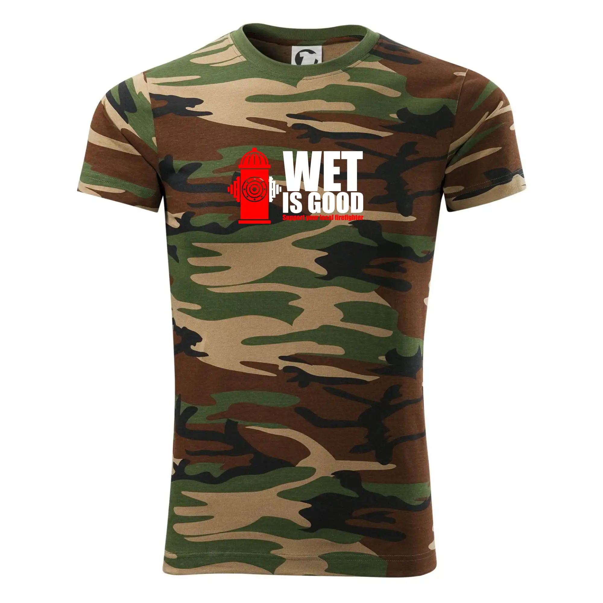 Tričko střední gramáže v barvách camouflage. Střih s bočními švy. Lem průkrčníku ze žebrového úpletu s přídavkem 5 % elastanu. Vnitřní část zadního průkrčníku začištěna páskou v barvě camouflage.