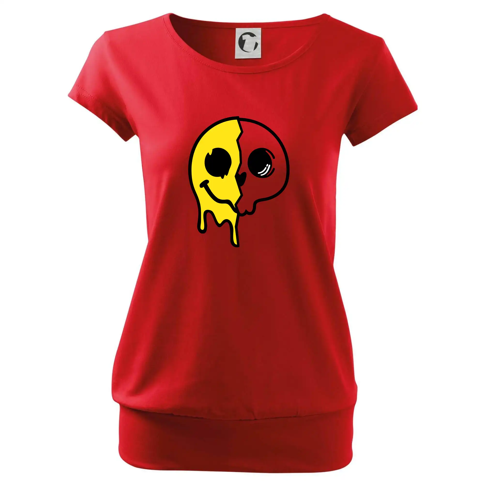 Trendové dámské triko s velmi krátkým rukávem, volnějšího střihu, v dolním kraji všité do širokého lemu. Kulatý průkrčník s úzkým lemem ze shodného materiálu.