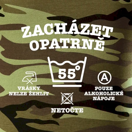 Tričko střední gramáže v barvách camouflage. Střih s bočními švy. Lem průkrčníku ze žebrového úpletu s přídavkem 5 % elastanu. Vnitřní část zadního průkrčníku začištěna páskou v barvě camouflage.