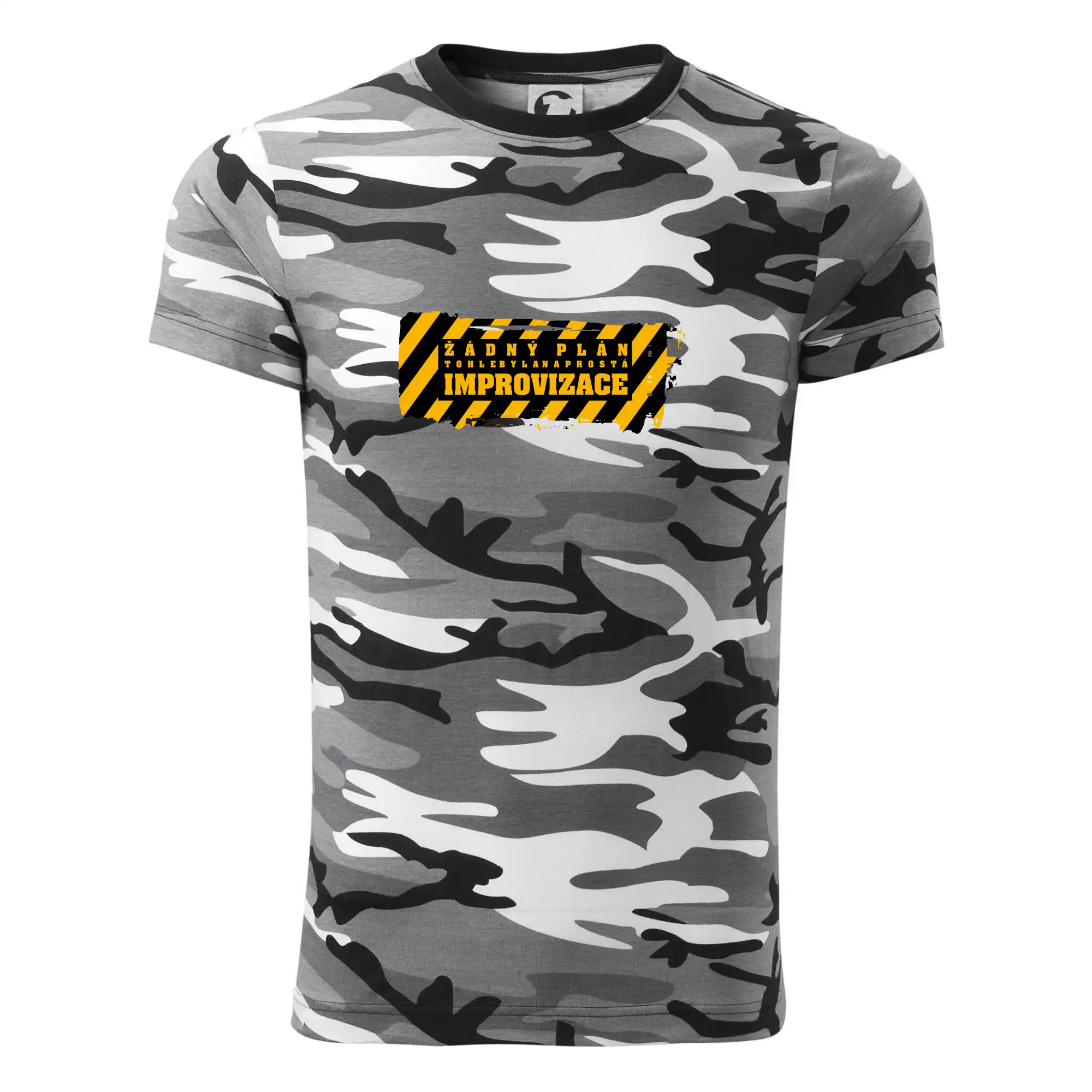 Tričko střední gramáže v barvách camouflage. Střih s bočními švy. Lem průkrčníku ze žebrového úpletu s přídavkem 5 % elastanu. Vnitřní část zadního průkrčníku začištěna páskou v barvě camouflage.