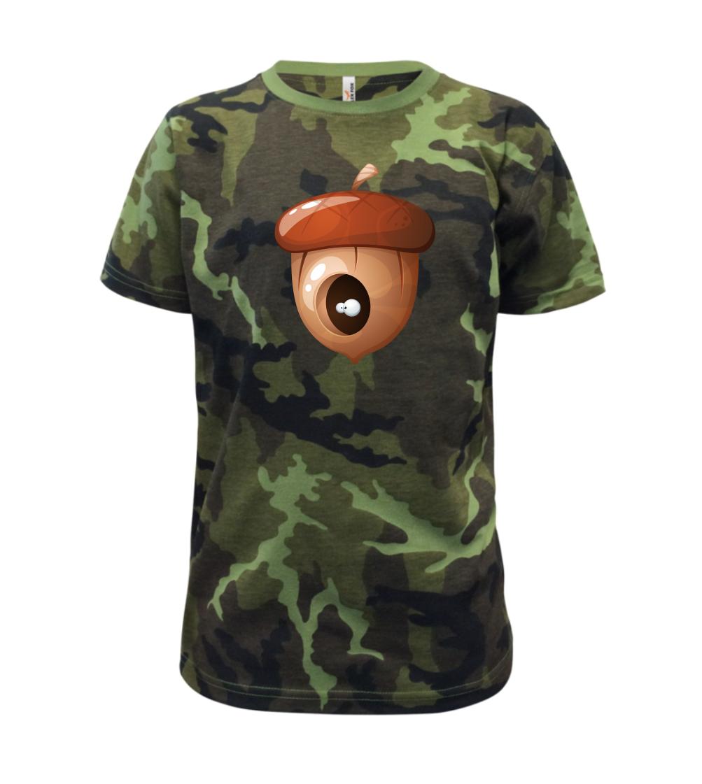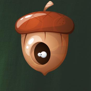Triko pro dítě, na kterém je žalud, ze kterého koukají oči. V žaludu má doupě veverka nebo jiné zvíře. Celý ořech nesnědla, pouze si v něm udělala úkryt.