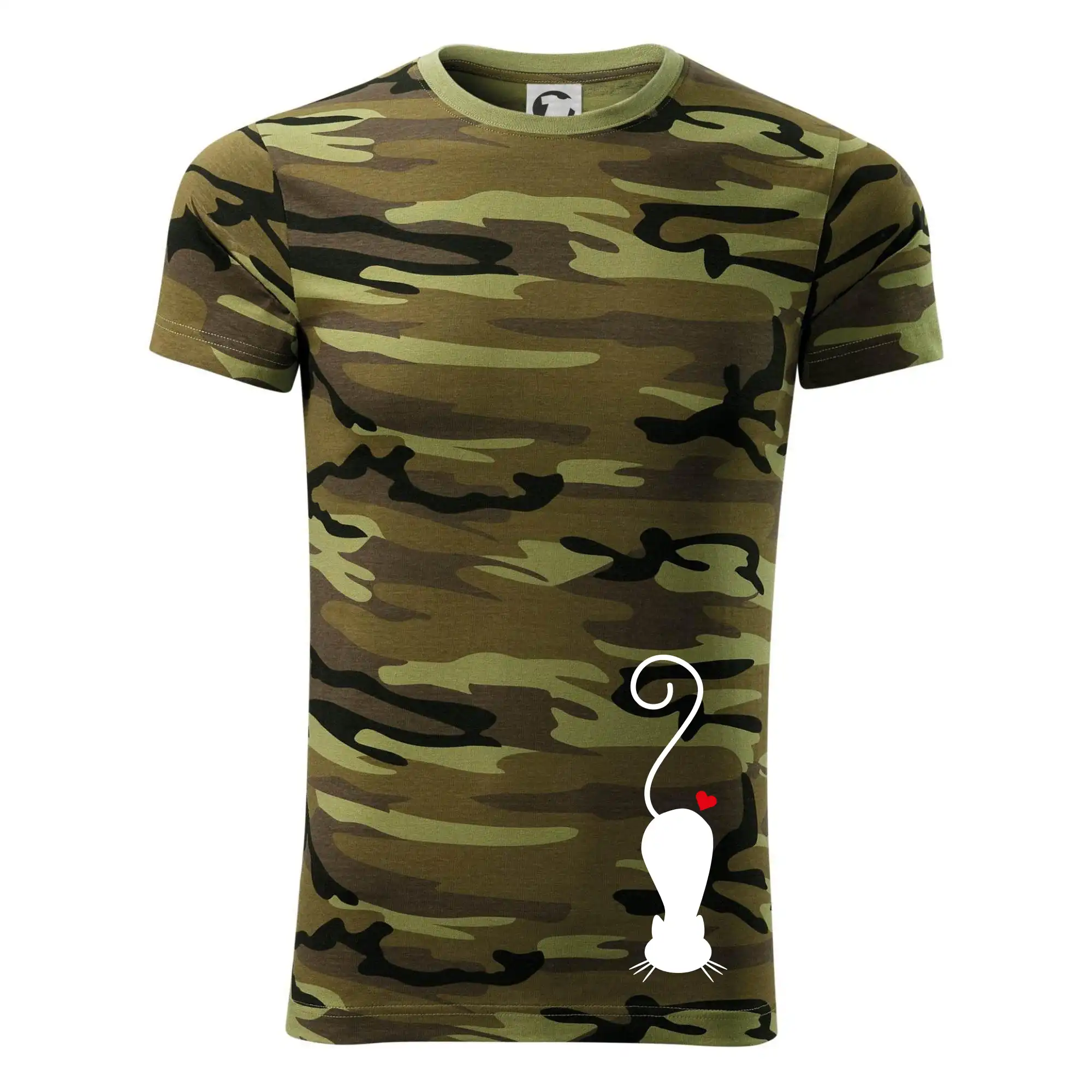 Tričko střední gramáže v barvách camouflage. Střih s bočními švy. Lem průkrčníku ze žebrového úpletu s přídavkem 5 % elastanu. Vnitřní část zadního průkrčníku začištěna páskou v barvě camouflage.