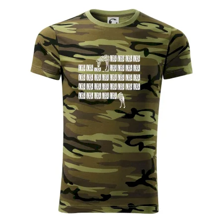 Tričko střední gramáže v barvách camouflage. Střih s bočními švy. Lem průkrčníku ze žebrového úpletu s přídavkem 5 % elastanu. Vnitřní část zadního průkrčníku začištěna páskou v barvě camouflage.