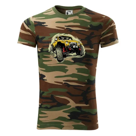 Tričko střední gramáže v barvách camouflage. Střih s bočními švy. Lem průkrčníku ze žebrového úpletu s přídavkem 5 % elastanu. Vnitřní část zadního průkrčníku začištěna páskou v barvě camouflage.
