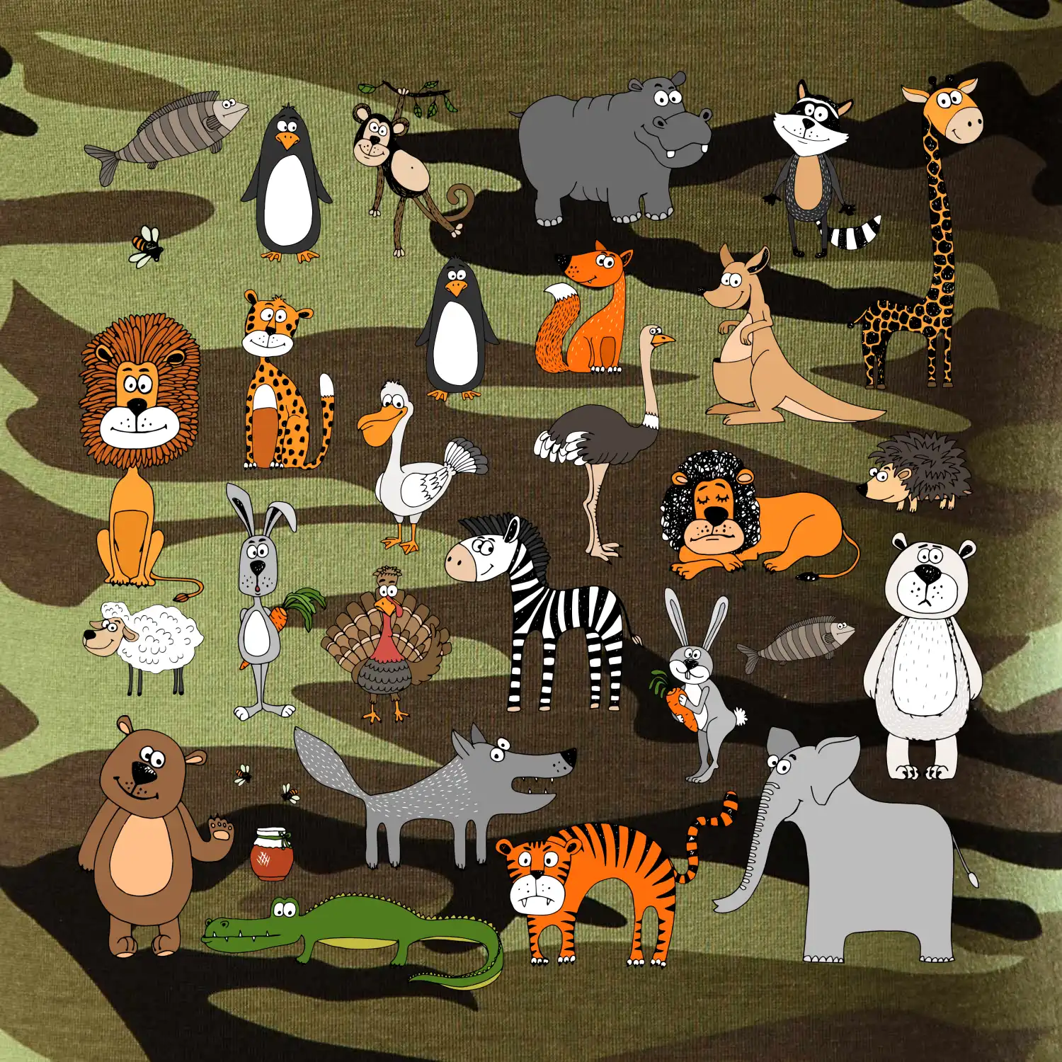 Tričko střední gramáže v barvách camouflage. Střih s bočními švy. Lem průkrčníku ze žebrového úpletu s přídavkem 5 % elastanu. Vnitřní část zadního průkrčníku začištěna páskou v barvě camouflage.